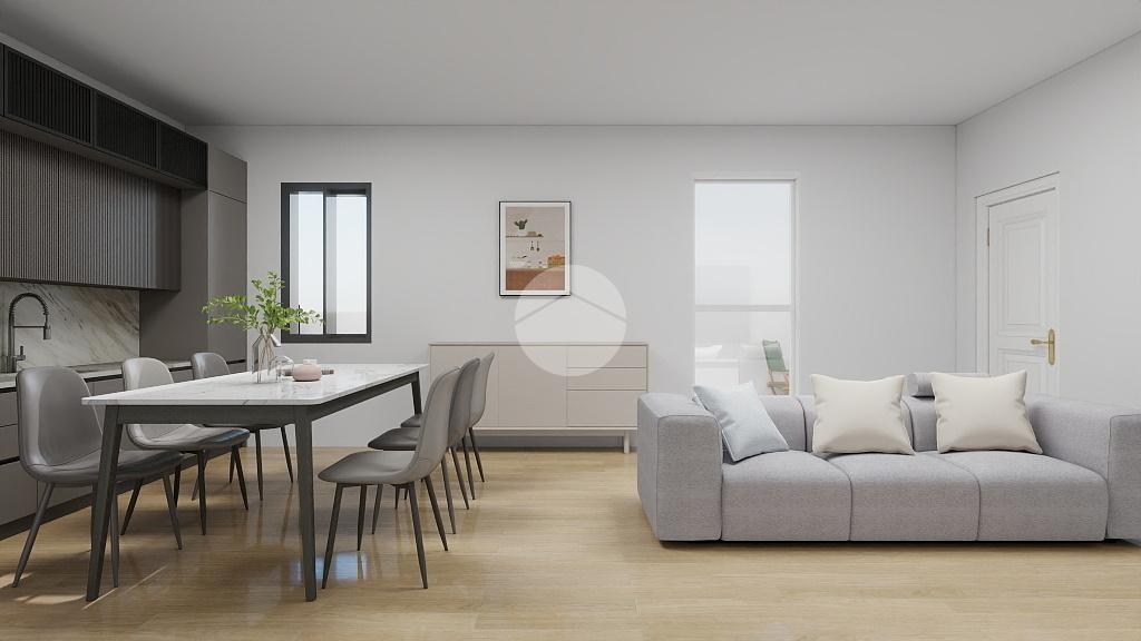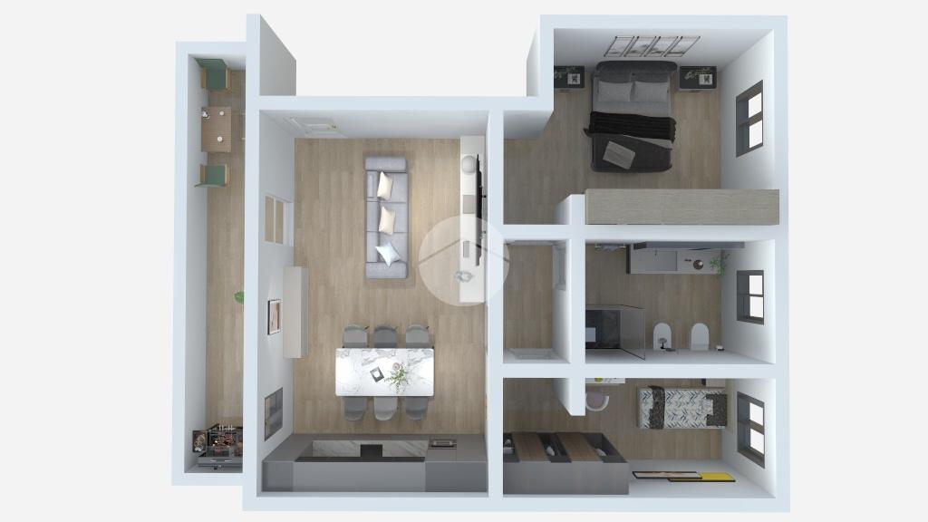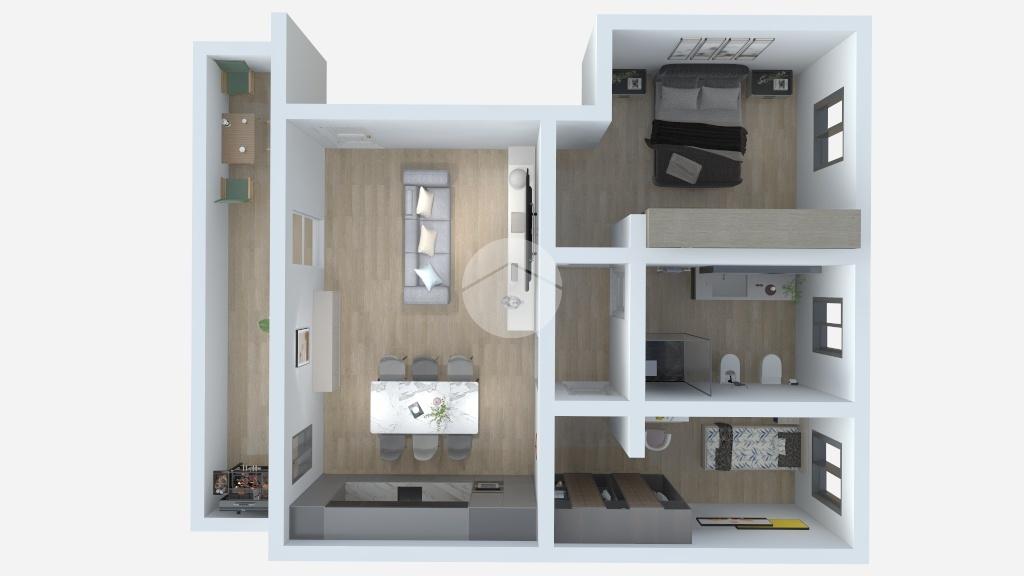 L'appartamento è composto da accogliente soggiorno con sbocco sul loggiato e ampia zona cottura.